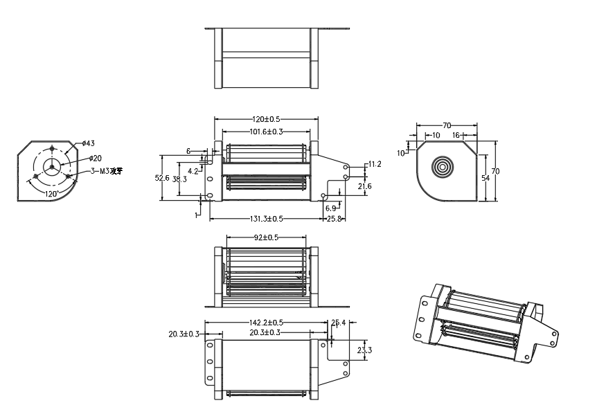 風輪尺寸:50*92mm,50是風輪直徑,葉片長度是92mm,可裝直流電機,